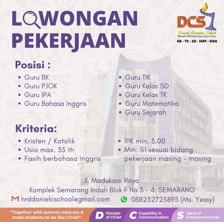 Daniel Creative School (DCS) membuka beberapa lowongan pekerjaan sebagai guru. Berikut informasi lengkapnya. Bagikan:Click to share on Twitter (Opens in new window)Click to share on Facebook (Opens in new window)